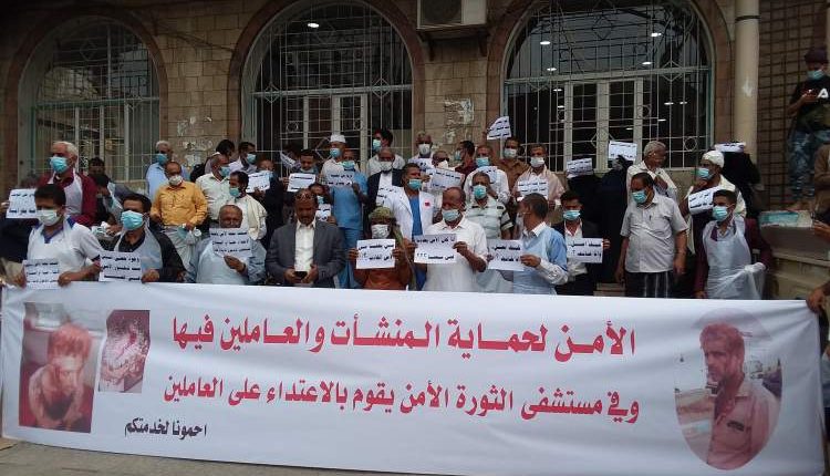 وفي السياق ذاته، نظم أطباء وممرضو وعاملو مستشفى الثورة في تعز، اليوم الأحد، وقفة احتجاجية للتنديد بالاعتداء الذي طال رئيس هيئة المستشفى على أيدي جنود المحور.