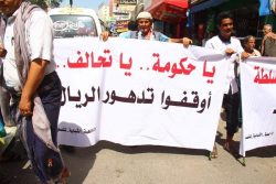 طالبت بإقالة حكومة معين وتغيير شمسان..مسيرة منددة بانهيار العملة والاقتصاد في تعز