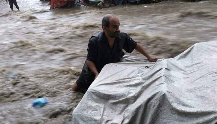 يصد السيل عن عربيته المتنقلة.. صورة مؤثرة ومعبرة عن الكفاح لصحفي يمني