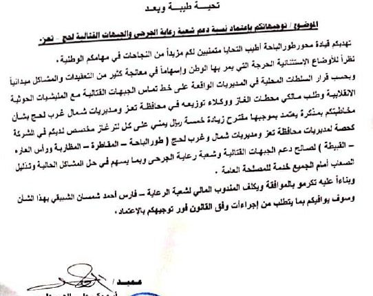 وكشفت مذكرة رسمية صادرة الأسبوع الماضي ، تحت توقيع ابوبكر الجبولي قائد محور طور الباحة ،طالب فيها مدير عام شركة الغاز صافر، بفرض زيادة على حصة الغاز المخصصة لمديريات تعز وأربع من مديريات لحج.