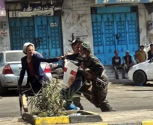 ويظهر الفيديو المتداول، اعتداء المدعو “صلاح الراشدي”، أحد مرافقي قائد محور تعز خالد فاضل، على أحد مصور قناة الجزيرة الصحفي “نائف الوافي”، وتهديده بالسلاح المباشر ومصادرة كاميرا التصوير والتلفظ عليه بألفاظ نابية أثناء رصد الصحفي لاعتداءات مجاميع المحور بحق المتظاهرين والتي أسفرت عن مقتل شاب وإصابة أخرين.