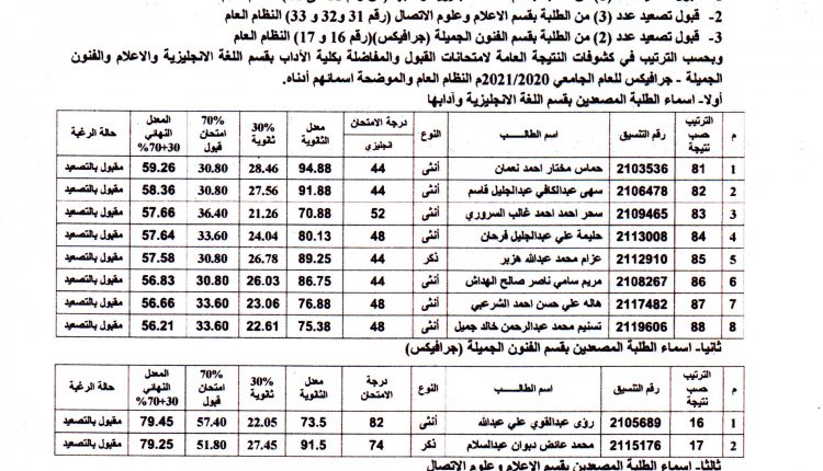 الطلبة المقبولين بالتصعيد كانوا في التخصصات الى (اللغة الإنجليزية وآدابها- الاعلام وعلوم الاتصال – الفنون الجميلة (جرافكس)