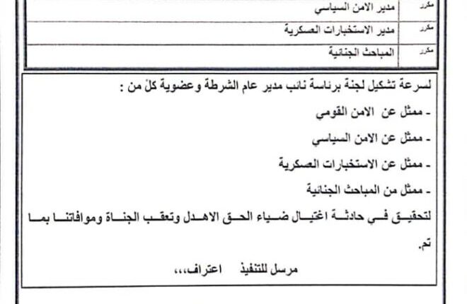 ووجه المحافظ بتشكيل لجنة برئاسة نائب مدير عام شرطة تعز وعضوية ممثلين عن الأمن القومي، والأمن السياسي، والاستخبارات العسكرية، والمباحث الجنائية، للتحقيق في حادثة اغتيال “ضياء الحق الأهدل”.