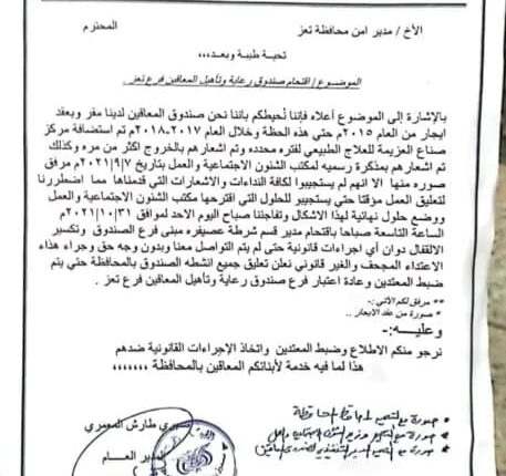 وأفاد بلاغ وجه الصندوق إلى مدير شرطة تعز، أن مدير قسم شرطة عصيفرة معاذ مارش، كسر قفل المبنى وقام بإدخال موظفي صناع العزيمة، إلى المبنى بالقوة، بعد أن تم استضافتهم لفترة محددة، وتم اشعارهم بالخروج من المبنى أكثر من مرة بمذكرات رسمية من مكتب الشؤون الاجتماعية والعمل.