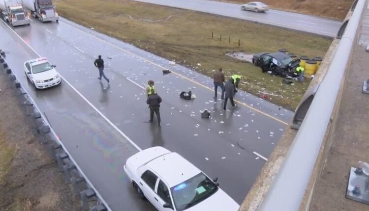 وأوقفت الشرطة في مكان الحادثة رجلا وامرأة تهافتا لجمع الأموال، لكنهما علقا خارج سيارتهما على الطريق السريع بعدما أغلقاها بالخطأ والمفتاح داخلها.