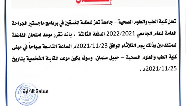وأشار الإعلان بان مجلس الكلية حدد يوم الثلاثاء القادم 23 نوفمبر بدء اختبارات المفاضلة للطلاب المنسقين في برنامج الماجستير قسم جراحة الدفعة الثالثة لعام 2021-2022.