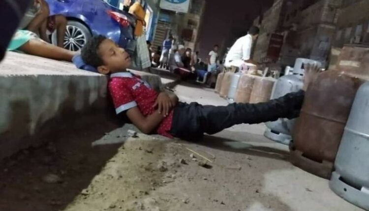 وتداول نشطاء صورة لطفل نام على قارعة الطريق بسبب الإرهاق الشديد وهو في سرب طويل من المواطنين المساربين ،ينتظر حصته من مادة الغاز في احد شوارع الحالمة تعز .
