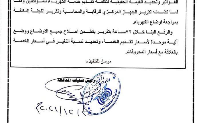 وجّهت السلطة المحلية بمحافظ تعز، بمراجعة أسعار خدمات التيار الكهربائي، وعمل آلية موحدة لأسعار تقديم الخدمة، خلال 72 ساعة.
