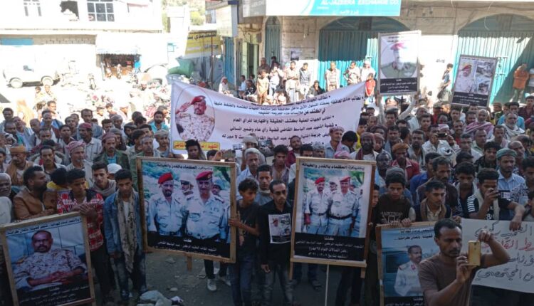 وقفة احتجاجية في تعز للتنديد بتخاذل الاجهزة الامنية في كشف ملابسات جريمة اغتيال ركن الإشارة في اللواء 35 مدرع