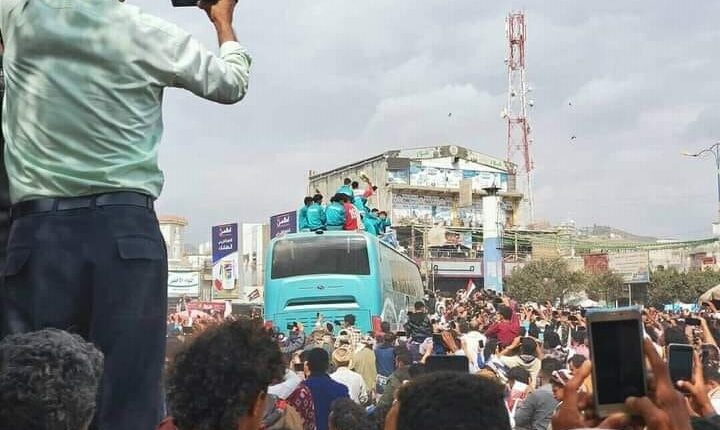 اصطف المئات من أهالي مدينة تعز، اليوم الثلاثاء، لاستقبال موكب المنتخب اليمني للناشئين في منطقة الحوبان شرقي مدينة تعز.