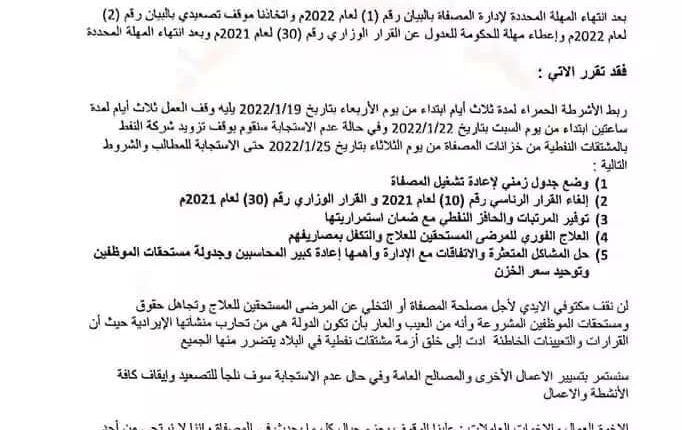 وحددت النقابة، في بيان لها، وضع جدول زمني لإعادة تشغيل المصفاة، وصرف المرتبات والمستحقات، والعلاج الفوري للمرضى من الموظفين بالإضافة إلى إلغاء قراران رئاسي ووزاري.