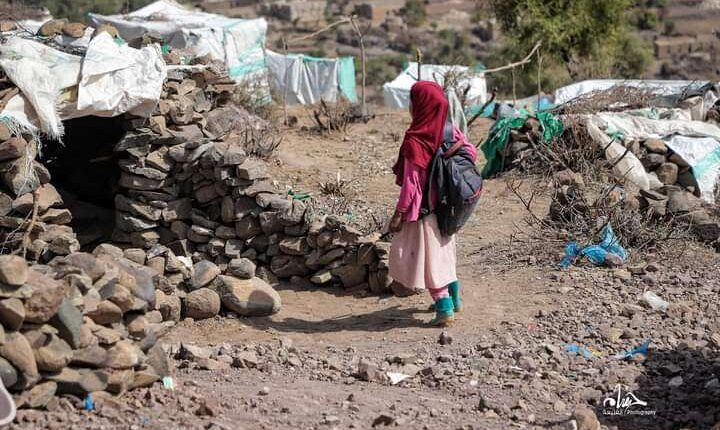 وتداول ناشطون صورة لطفلة في أحد مخيمات النزوح في مقبنة، اثناء عودتها من المدرسة للخيمة التي يسكنوها ..