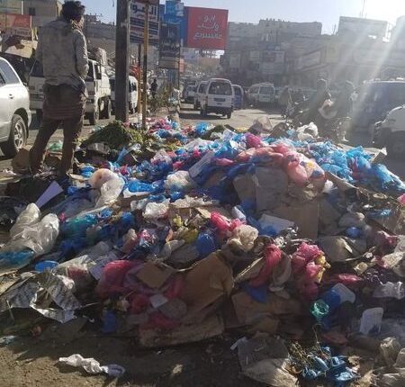 تكدس اكوام القمامة في مدينة تعز مع اقتراب شهر رمضان المبارك
