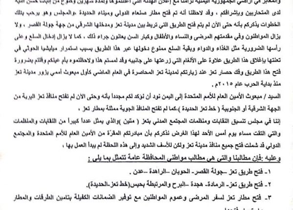 دعا مجلس تنسيق النقابات ومنظمات المجتمع المدني بمدينة تعز، المبعوث الأممي “هانز غروندبيرغ”، إلى العمل على فتح مطار تعز الدولي والطرق البرية المؤدية إلى المدينة.