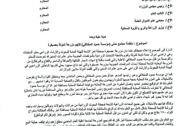 كشفت وثيقة صادرة عن نقابة الباحثين الزراعيين ، تفيد بقيام مؤسسة القيادي البارز في حزب الإصلاح الشيخ حمود المخلافي بضم مزرعة عصيفرة التابعة للهيئة العامة للدراسات والبحوث الزراعية، إلى أملاك المؤسسة .