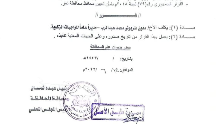 أصدر محافظ تعز نبيل شمسان ،اليوم الثلاثاء ،قرارا يقضي بتعيين مديرا لمكتب الواجبات الزكوية بعد توقيف المدير السابق عن العمل منذ يونيو 2021 .