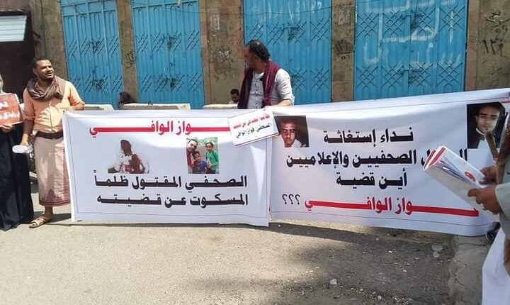 نفذت أسرة الصحفي فواز الوافي وعدد من ناشطي تعز، الثلاثاء، وقفة احتجاجية أمام مبنى النيابة العامة في المدينة، للمطالبة بسرعة استكمال ضبط المتهمين بجريمة قتل ابنها الصحفي الوافي، ومنددة بالمماطلة والتلاعب الذي تقوم به الأجهزة الأمنية في القضية.