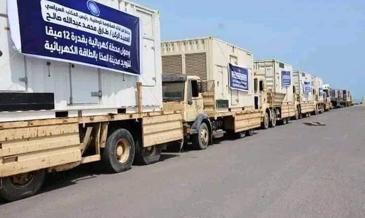 وقالت المصادر، بانه تم نقل اكثر من 8 مولدات عملاقة بقوة 12 ميجا الى مدينة المخا ، بتوجيهات صادرة من عضو المجلس الرئاسي طارق صالح ، كانت مخصصة لمدينة تعز كمرحلة أولى.