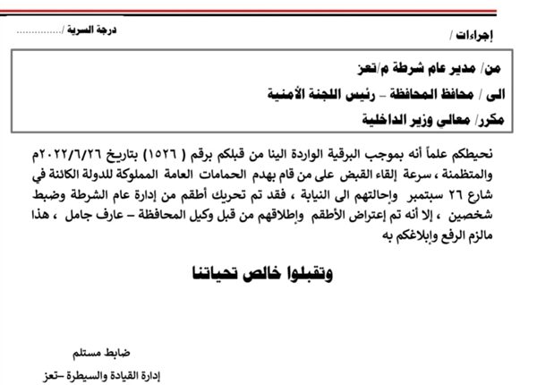 وتشير الوثيقة الصادرة من شرطة تعز إلى محافظ المحافظة ووزير الداخلية، إلى اعتراض وكيل السلطة المحيلة ورئيس فرع المؤتمر الشعبي العام في المحافظة عارف جامل، أطقم أمنية واطلاق مسلحين تم القبض عليهم، على خلفية قيامهم بهدم الحمامات العامة المملوكة للدولة الكائنة في شارع ٢٦ سبتمبر.