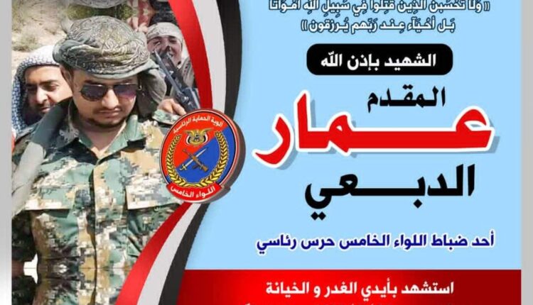 نعى اللواء الخامس حرس رئاسي ، على صفحته في موقع التواصل الاجتماعي “فيسبوك” الرائد عمار الدبعي ،الذي اغتيل مساء الخميس ،وسط مدينة تعز.. مؤكدة أنه سقط بـ “أيدي الغدر والخيانة”.