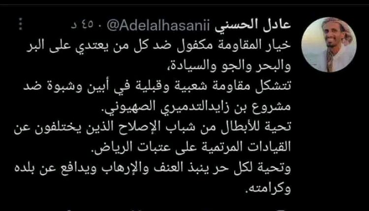 وأكد عادل الحسني، في منشور له على صفحته بمواقع التواصل الاجتماعي، بدء ترتيبات لتشكيل مقاومة شعبية في أبين وشبوة ضد ما وصفه بمشروع بن زايد الصهيوني.