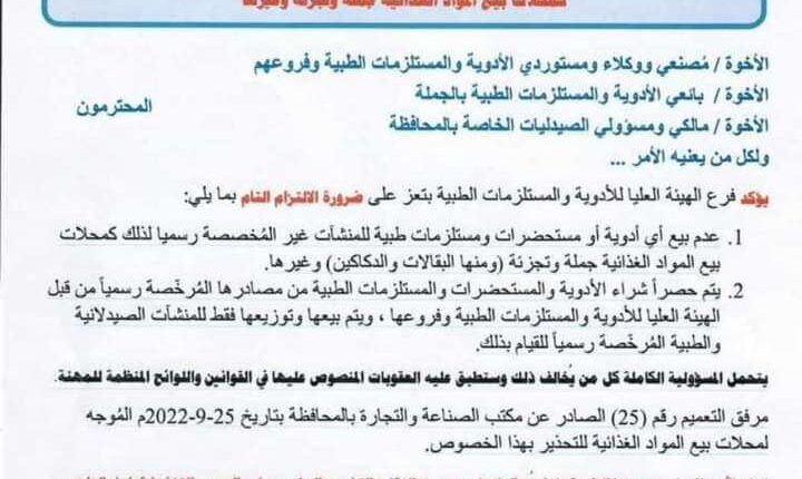 حذرت الهيئة العليا للأدوية والمستلزمات الطبية بمحافظة تعز، جميع وكلاء ومصنعي الأدوية والمستوردين من بيع الأدوية والمستحضرات والمسلتزمات الطبية للمنشآت غير المرخصة ومحلات بيع المواد الغذائية.