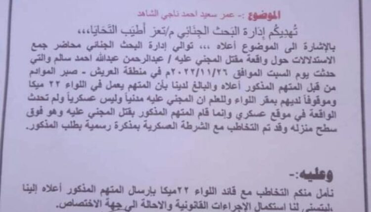 وتكشف المذكرة الصادرة من إدارة البحث الجنائي إلى مدير عام شرطة تعز، بقيام اللواء 22 ميكا بنقل المتهم بقتل المواطن عبد الرحمن عبد الله الحماطي في قرية العريش بمديرية صبر الموادم، إلى مقر اللواء ورفضه تسليمه للبحث.