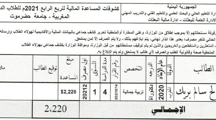 وتظهر الوثائق صرف مستحقات منحة لشقيق وزير المالية سالم صالح بن بريك للدراسة التربية الجمالية في المغرب بمبلغ يتجاوز 2200 دولار للربع الواحد، في حين أن المذكور كان قد توفى في أغسطس من العام الماضي.
