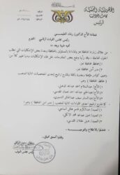 وتشير الوثيقة الصادرة من رئيس سلطة برلمان الشرعية سلطان البركاني والموجه إلى رئيس مجلس القيادة الرئاسي رشاد السامعي، باقتراح البركاني تغيير كلا من محافظ المحافظة ومدير الأمن لحل ما وصفه بالإشكالات العاجلة.