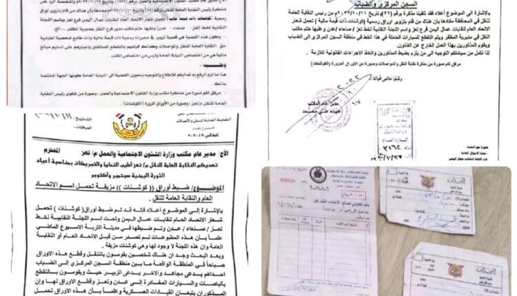 وتوضح الوثيقة التي رئيس النقابة العامة للنقل بمحافظة تعز، عبد العزيز البطر، إلى مكتب وزارة الشؤون الاجتماعية والعمل في المحافظة، أن تم “ضبط أوراق “كوشنات” مزيفة تحمل اسم الاتحاد العام والنقابة العامة للنقل وتحت اسم اللجنة النقابية لخط تعز صنعاء / عدن في مدينة التربة الأسبوع الماضي”.