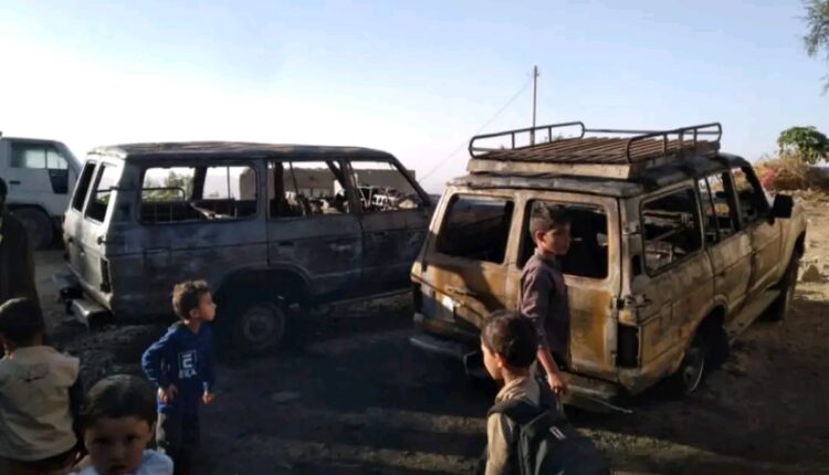 تعز | عصابة مسلحة تضرم النار في سيارتين لأحد مشائخ المسراخ