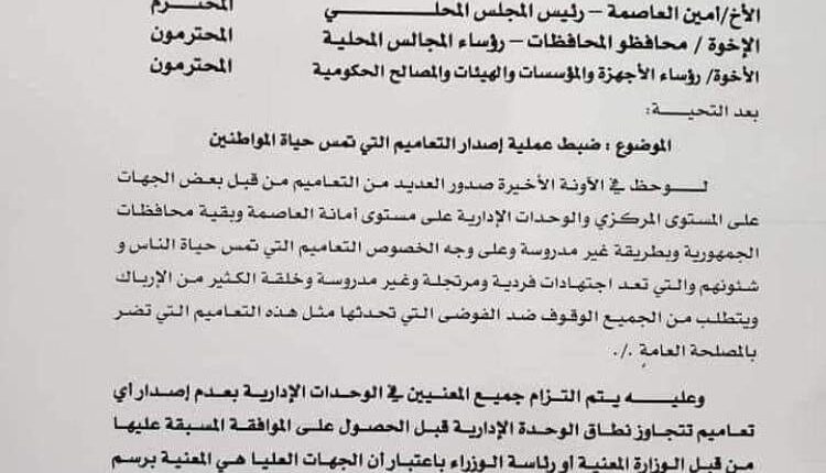ونصت المذكرة الصادر من رئيس حكومة الحوثيين، عبد العزيز بن حبتور والموجهة إلى أمين العاصمة ومحافظي المحافظات، بإيقاف عمليات التعميمات التي تمس حياة الناس وشؤنهم والتي وصفتها المذكرة “بالاجتهادات الفردية غير المدروسة”.