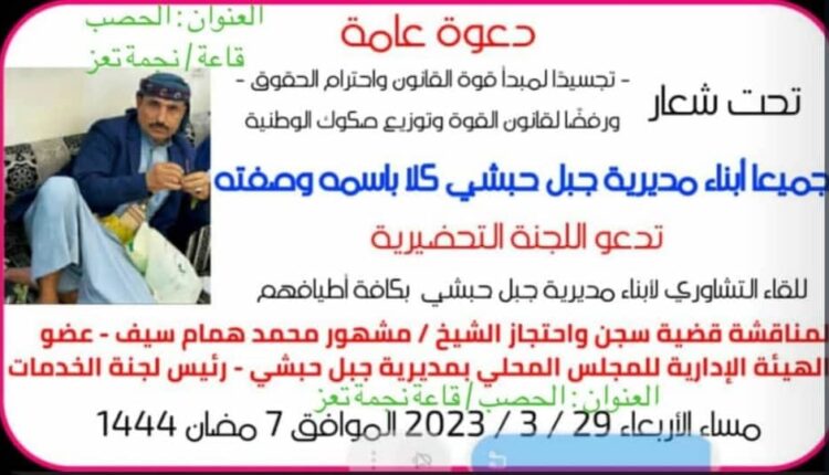 للمطالبة بالإفراج عن أحد مشايخ المديرية..أبناء جبل حبشي يتداعون للقاء تشاوري جامع