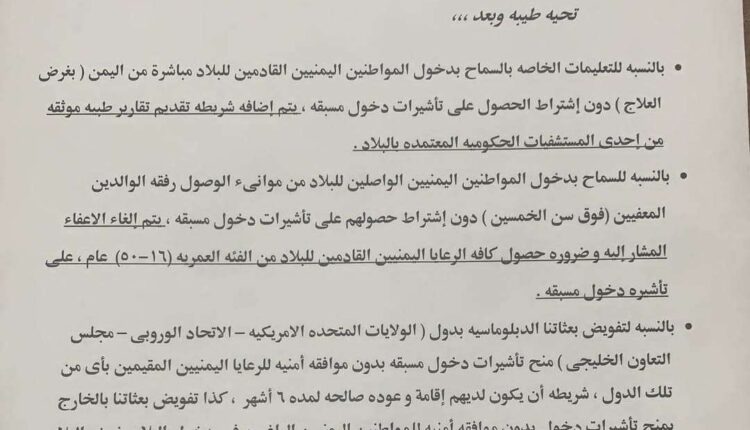 يذكر أن السلطات المصرية كانت تسمح لليمنيين بدخول مصر بتقرير طبي يمني معتمد من وزارة الصحة في عدن حتى لحظة صدور القرار.