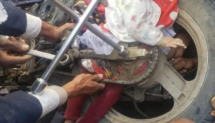 وأضافوا أن المواطنين تدخلوا وقاموا بفتح إطار الدراجة النارية وإخراج الطفلة سالمة لكنها أصيبت ببعض الجروح.