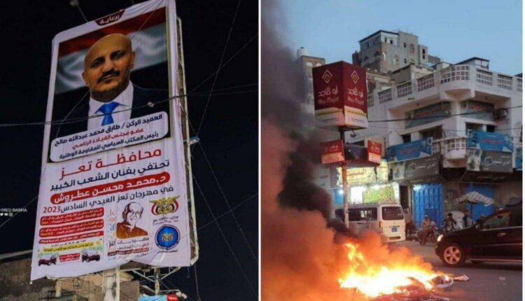 أضرم جرحى تعز، الثلاثاء، النيران في اللوحات التي رفعها مكتب الثقافة وسط المدينة وتحمل صور قائد القوات المدعومة إماراتيا طارق صالح، على هامش المهرجان العيدي.