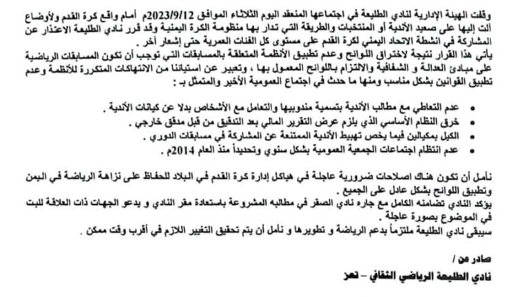 تعز | نادي الطليعة يعلن انسحابه من أنشطة الاتحاد اليمني لكرة القدم