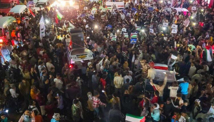 احتشد المئات في مدينة تعز، مساء اليوم السبت، بعد صلاة المغرب، دعما لعملية طوفان الاقصى واحتفاءً بانتصارات المقاومة الفلسطينية على الكيان الإسرائيلي والتنديد بعدوانه على المقدسات.