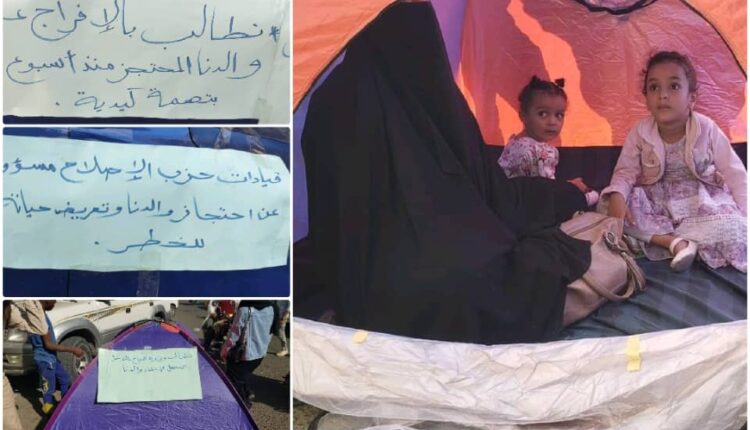 اسرة المعتقل “القدسي” نصبت خيمة صغيرة امام مقر الإصلاح وسط مدينة تعز للضغط على قياداته للإفراج عن المخفي قسريا منذ أسبوع في أحد سجون قوات الإصلاح.