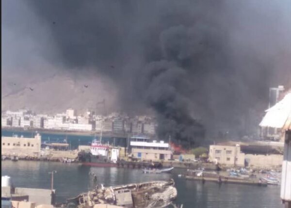 وقالت مصادر محلية في المدينة إن أصوات انفجارات كبيرة سمع دويها في كثير من أحياء المكلا مع تصاعد لألسنة اللهب بسبب اندلاع حريق بسامبوك في الميناء.