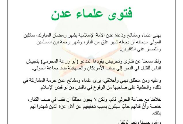 فتوى لعلماء ودعاة عدن تحرم القتال إلى جانب الأمريكيين ضد الحوثيين