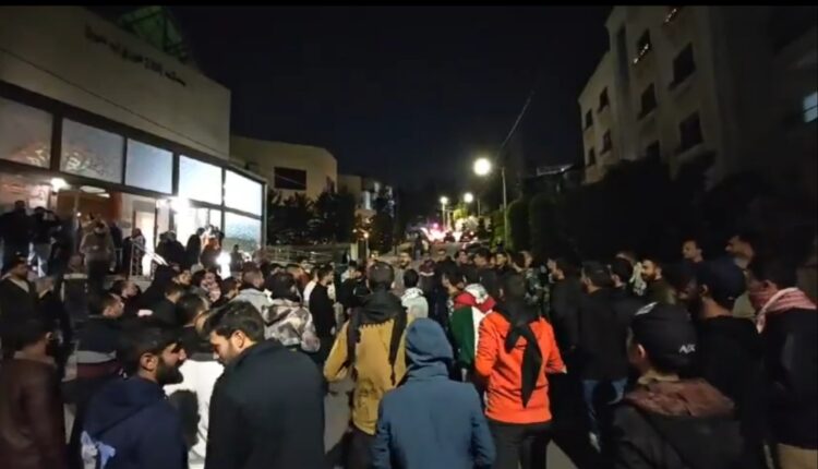 واحتشد الآلاف من الأردنيين قرب سفارة الاحتلال، مساء الخميس، مرددين هتافات “لا سفارة ولا سفير.. اطلع برا يا خنزير”.