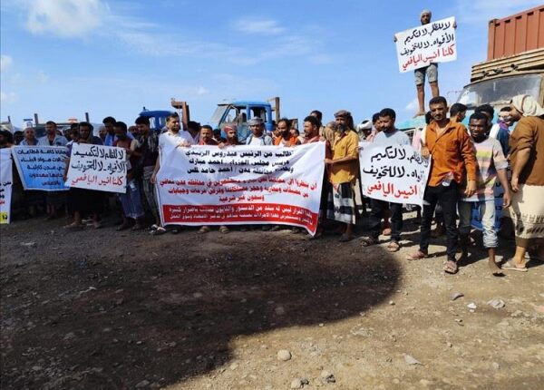 وأوضح المحتجون أنهم مستمرون في التصعيد وتنفيذ وقفاتهم الاحتجاجية حتى تنفيذ مطالبهم، والافراج عن التاجر “اليافعي”، وتوقيف إجراءات منع بيع مواد البناء والبناء إلا بترخيص، وفرض غرامات مالية وحجز السيارات والأشخاص بطرق غير قانونية.
