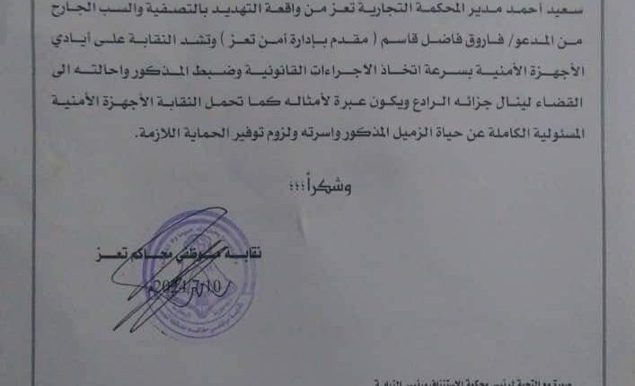 وذكرت النقابة، في مذكرة رسمية بعثتها للسلطات، “تتابع النقابة بقلق بالغ ما تعرض له الزميل معاذ عبده سعيد أحمد، مدير المحكمة التجارية تعز، من واقعة تهديد بالتصفية والسب الجارح من قبل المدعو “فاروق فاضل قاسم”، مقدم بإدارة أمن تعز” وهو شقيق قائد المحور خالد فاضل”.