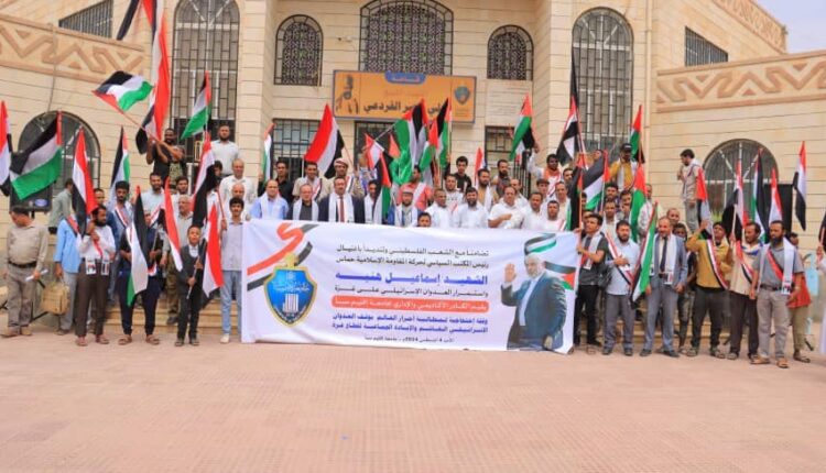 شهدت مدينة مأرب وسط اليمن، اليوم الأحد، وقفة طلابية منددة بجريمة اغتيال رئيس المكتب السياسي لحركة حماس، إسماعيل حماس، وتضامنا مع غزة.