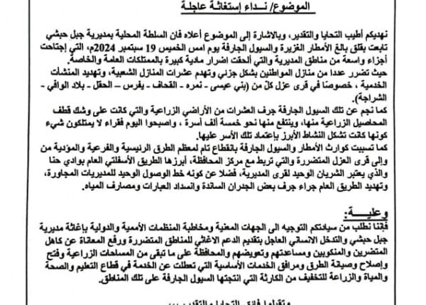 ناشدت السلطة المحلية في مديرية جبل حبشي في محافظة تعز، اليوم السبت، سلطات وحكومة الرئاسي والمنظمات الأممية، إغاثة أبناء المديرية نتيجة الاضرار التي خلفتها السيول.