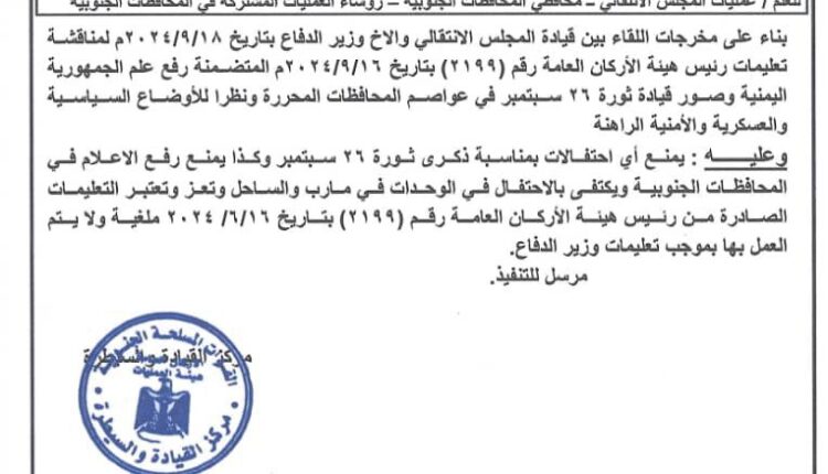 وتنص المذكرة الصادرة من مركز القيادة والسيطرة بقوات الانتقالي بإلغاء التعليمات الصادرة من رئيس هيئة الأركان بالاحتفال بذكرى ثورة 26سبتمبر ، او رفع اعلام الجهورية، والاكتفاء بالاحتفالات في مدينتي مأرب وتعز والساحل فحسب.