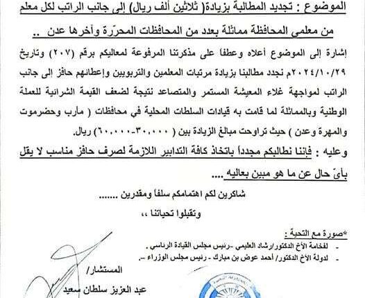 وجاء في خطاب النقابة الموجه إلى شمسان، أن ” هناك ضرورة لاتخاذ الإجراءات اللازمة لصرف هذه الزيادة في أقرب وقت ممكن، لتخفيف معاناة المعلمين الذين يواجهون تحديات كبيرة في تغطية احتياجاتهم المعيشية المتزايدة”.