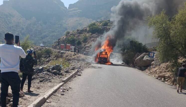 حريق يلتهم حافلة ركاب في نقيل هيجة العبد