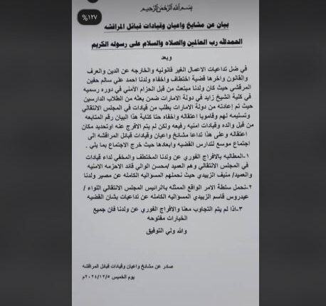 وأوضح بيان صادر من القبيلة أن” أحمد حفين المرقشي كان مبتعثًا من قبل الحزام الأمني في دورة رسمية بكلية الشيخ زايد في دولة الإمارات ضمن بعثة من الطلاب الدارسين، حيث تم إعادته من الإمارات بطلب من قيادات في المجلس الانتقالي وتسليمه لهم، ليتم اعتقاله وإخفاؤه حتى كتابة هذا البيان، رغم المتابعة المستمرة من قبل والده وقيادات أمنية رفيعة”.